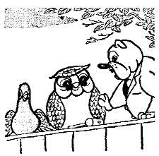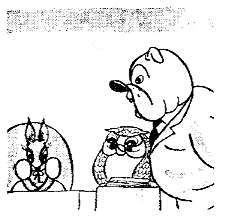 ふくろう裁判長がおこっています。ブルドッグ検事は、しかたなく腰をおろしました。