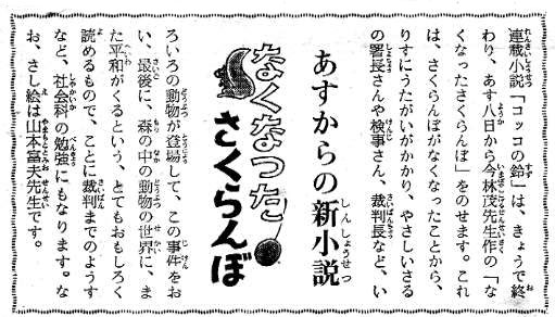 第1章_なくなったさくらんぼ 第2章 さるの警察署長足あと発見 第3章 ブルドッグ検事登場 第4章 捜査はすすむ 第5章 裁判 第6章 二回目の裁判 第7章 ひとやすみ 第8章_三回めの裁判(証人はお月さま?) 第9章 また春がきて 各章のはじめに前章までのあらすじをつけております。どこからでもお読みください。