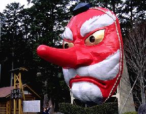「春野町?ああ、大きなてんぐのあるところまで言ったことがあるよ。という声を聞きます。縦8m、横6m、鼻の長さが4mにもなる、大きな天狗面です。 この地は修験道といって、山々には修行を行う行者が暮らしていました。秋葉修験といいます。そうした行者の管理する地域であり、道であったので、東海道よりも安全な道であったといわれています。そうした行者の姿が、山をたいまつを持って早く歩く姿などが、天狗のイメージと重なって、天狗と火の伝説になっていったようです。