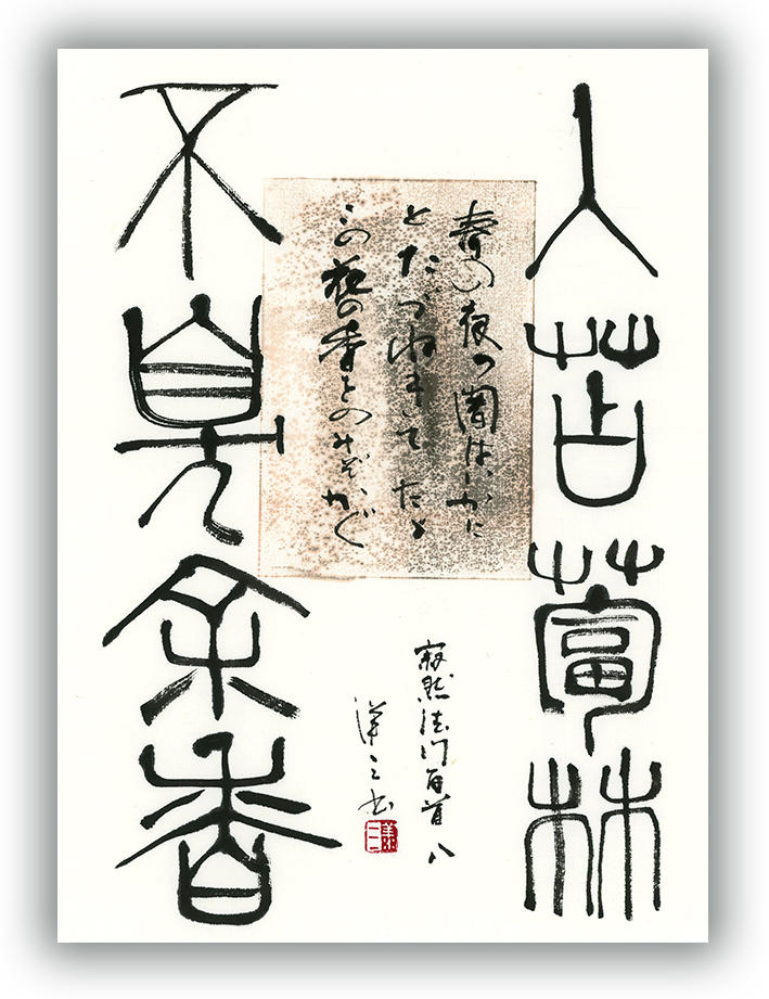 維摩の室を尋ねると仏の功徳のみを聞く。これを、春の夜の闇で梅の香ばかりを嗅ぐという古歌の心より詠んだ。(中略)春の夜の闇の奥に、梅の香りとともに維摩居士が現れる。