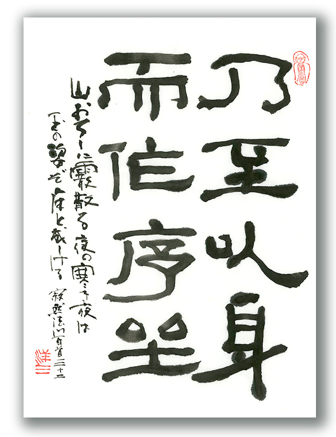 釈尊が国王であった時、法華経を知るために阿仙人に仕え、その身を仙人の床坐となした。この場面を、山おろしが吹き荒れる冬の霰の夜の情景の中で詠んだ。出家は厳しい冬の勤行を、仏のこうした行を思い起こしながら耐え忍んだのだろう。(以上、『寂然法門百首全釈』山本章博著 による。)