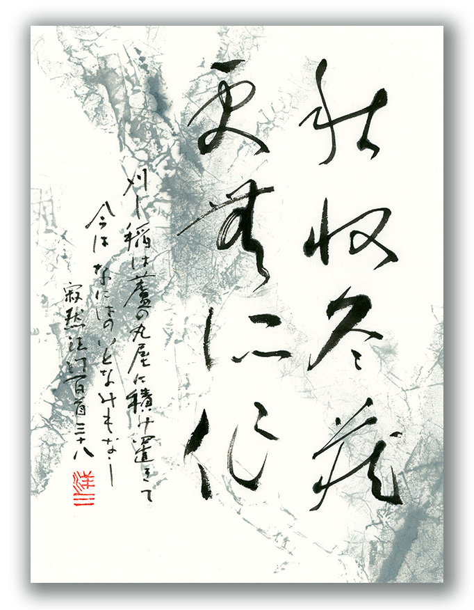 声聞は、『華厳経』から順次五時の教えを受け、最後に『法華経』の中で記別を受けて仏となり、すべてを成し終える。それを秋の収穫と冬の備えを終えた農夫にたとえたのが題の文。さらに難波の「寒蘆」を詠みこむことによって冬の歌とした。