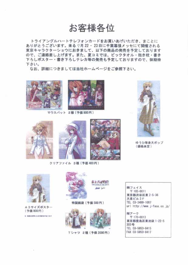 その後、店を転々とする。予約してあったセンチ2を購入。予約特典のサードウィンドウのジャケット絵(12人のヒロインのがあるらしい、つまり全12種(^^;)が晶だったんで、ちとがっくし。メソメソ。まぁ、晶は俺的4位くらいなので、妥当な線かな。えみりゅんとかでなくて良かった(^^;
