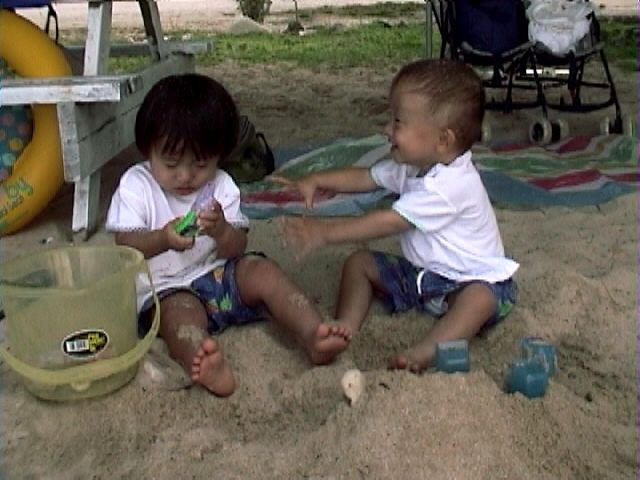 パラソルの下、浮き輪に座らせて、二人は砂遊び。バケツには海水、水鉄砲。