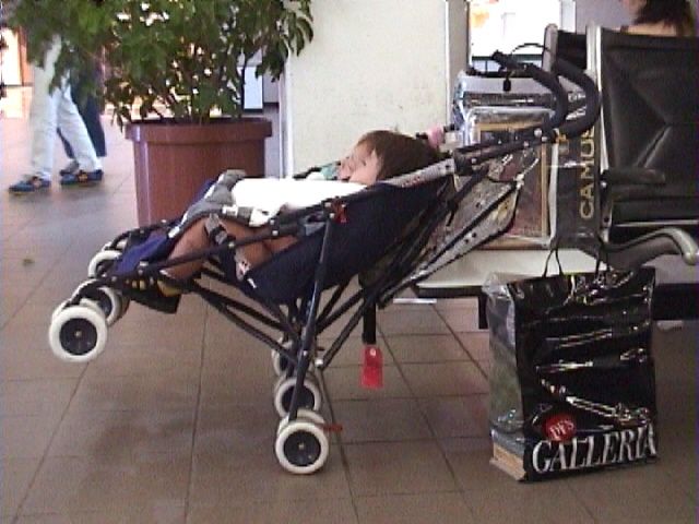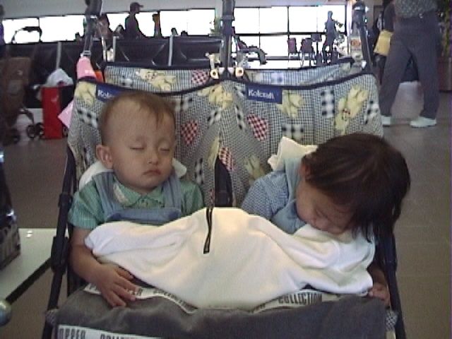 サイパンの空港でチェックイン、さて、座席は・・・12EとG、どういう席なんだろう。行きのことがあったからちょっと不安。出国検査はすごく簡単。はんこおして、通ったらそこはDFSの中という(^^;)大きくなったらしい、DFS。ちょっと買い物。ふと気づくと、2人とも寝てる。ありゃりゃ。パパはレストランへビールを飲みに。実はそこでしかタバコを吸えないから、4ドルも出して2回も飲みに入った。待合ロビーには子連れが沢山。ベビーカー沢山。一番奥のガラス張りでその向こうに飛行機が見える絨毯引きのところには、よちよち歩きの子供連れが沢山たまってた。ウチの双子も起きてれば楽しく遊べたろうに。普通、空港で思いっきり遊ばせて機内では寝てもらうのが定石なんだけどなあ。寝ちゃったものはしかたない。