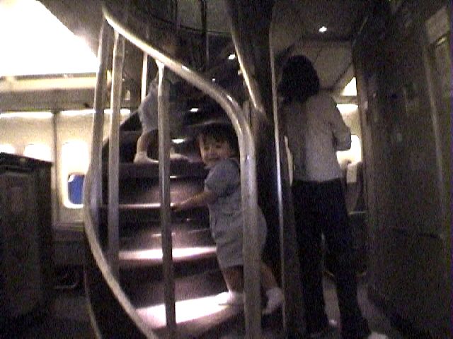離陸時はまたあーくんはラムネ攻撃、たーくんはおとなしくパパに抱っこ。ベルトサインが消えるとすぐに、FAさんが、ベビーミールを持ってきた。列車の形した箱にはいったクッキー、バナナ、かわいいポーチにガーバーの瓶詰め2つ、スタイ、飛行機の形したかわいいスプーン、それとおもちゃは、定規と飛行機の模型。模型はパパ用。定規はすぐに飽きられてしまった。飲物もらってクッキーを食べさせる。よく食べること。トレーの上で並べて遊んだりもしてる。一段落して親も機内食。これまたパスタを中心に、2人とも食べる食べる。でも広いおかげで、親2人とも同時に、一応はゆっくりと食べられた。後は、席の周りで遊んだり、ビデオ、写真撮ったり。ちょっと先の非常口のところの席が空いてたので、そこで遊ばせたり、そこのトイレにはおむつ換え台があったので入ったり。窓から夕日が綺麗で、眺めてたり撮影したり。アッパーデッキに上がる階段があって、そこは2人して登ったり降りたりと楽しそう。でもベテランの男性FAさんに、「何人もそこから落ちているので、危ないので気をつけてください」と言われた。登るなってことだろうな(^^;)他の席の人にあいそ振りまいたり、じっとしてない2人、寝るなんてとんでもない。乗る直前まで寝てたもんな。ジュースこぼしたりもして、手元に置いておいたお絞りは大活躍。パパはビールしっかり飲んでるし、私は行きに懲りて、気持ち悪くなると困るのでやめといたけど(アルコール弱い私)。最後に2人してコーヒーも飲めたし、よかったよかった。そうこうしているうちに、あっという間に着陸体制。また抱っこしたけど、どうしていつもこうなんだろう。たーくんはパパに抱っこされて、タオルをくちゅくちゅしながらおとなしい。あーくんはすぐに暴れるのでラムネ。でもでも、ラムネの残りが少ない!なるべく間をあけながらあげたけど、着陸まではもったけど、それから走行中におしまいになって、あとは暴れるまま。ああ、一応セーフかな。ありがとう、ラムネ君。