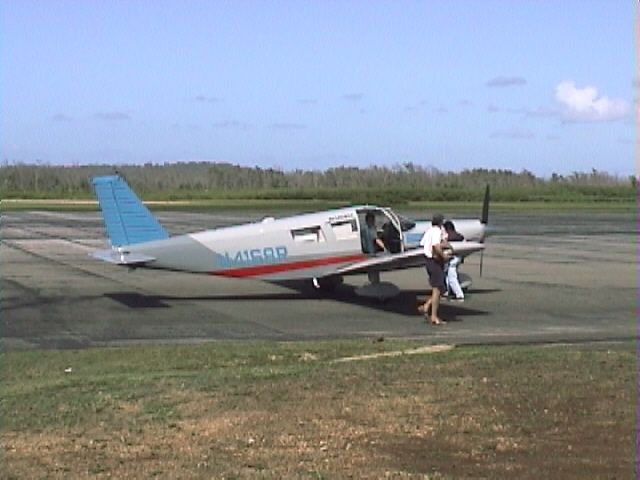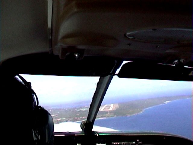 6人乗りのセスナまで歩いて乗りこむ。翼の上に乗ってコーパイのドアから乗り込むのだが、子供を抱っこしてはちと辛い。やったけど。いざ離陸。わくわく。パパはビデオを撮ってる。楽しいなあ。後ろの座席には欧米人2人。わくわく。空中から見るテニアンの風景、綺麗だあ。断崖が続く。海の色がエメラルドグリーン。綺麗。ビーチの色とはだいぶ違う。すぐにサイパンが見えてくる。これもいい風景。やっぱり行きもセスナにすべきだったよ。あっという間、飛んでる時間は5分ほどでもう到着。楽々。