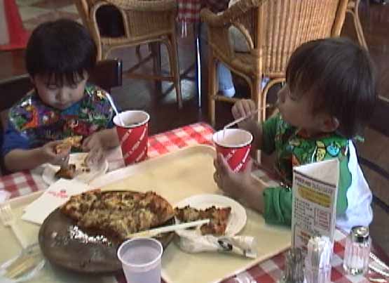 港のターミナルビル「とまりん」でランチ。ピザ、タコス、アイスティー。が、たーくんがほとんど食べない。お茶ばかりがぶがぶ。途中、トイレに行きたいというので連れていくも、出ず。結局、1口も食べないまま、残したピザはテイクアウトして船に乗り込む。