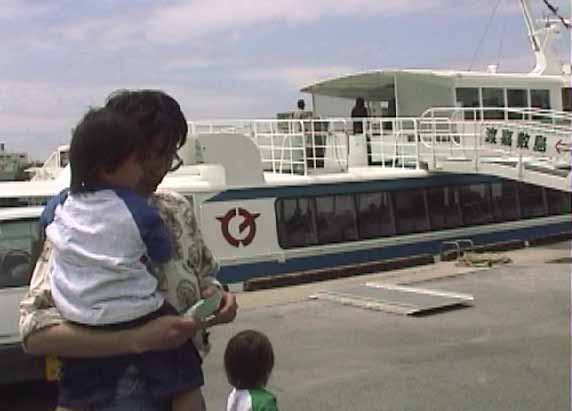 「マリンライナーとかしき」で35分で渡嘉敷島へ。去年就航したばかりの船で新しいため、私の苦手な「新車のにおい」がまだしている。スピードが速いので結構揺れる。これ以上弱らないように、と祈りつつ、乗っていると、急にたーくんが大量に吐いた。びびびっくり。被害はシャツ2枚だけだったので、脱がせ、あーくんの着ていたシャツ2枚のうち1枚を脱がせて着せ(双子って便利)、席を倒して寝かせる。大丈夫だろうか。食欲魔人のウチの子が食欲がない時はやっぱり何か変なのだ。青い顔をして寝てる。そのうちあーくんも寝てしまった。来る前、2人とも鼻と咳の風邪を引いていて、医者から薬は沢山もらってきてるのだが、吐き気止めや嘔吐下痢の薬は持参してないぞ。その手の風邪だったらどうしよう。かわいそうなことをしてしまったか?心配しながら、船は島に到着。