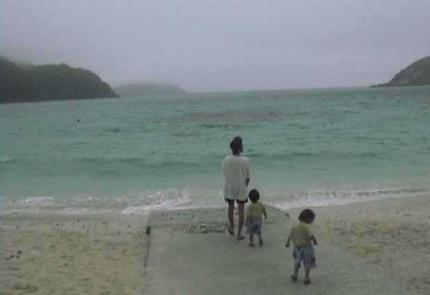 予報では1日雨だが、昼前には上がって明るくなってきた。昨日教えてもらった店にお昼を食べに行く。民宿から徒歩1分。「まめや」のちょうちんが下がっている。店に入って座るとけっこうお客さんがいる。いたいた、あのおやじさんだ。子供たちを見ると、「あれ、去年もいらっしゃいませんでした?」覚えてくれていた。厨房にいたおかみさんもちゃんと覚えていてくれた。「ずいぶん大きくなりましたね」店は大きくなり、2人できりもりしているらしく、かなり忙しそう。ゆっくりでいいですよ、と言って、かなり待ったが、子供たちもおとなしく待っていてくれた。サービスで出してくれたジーマーミ豆腐、これこれ!この味だよん。もちろん子供たちも大好き。落花生で作ったお豆腐、おかみさんが作ってる。沖縄そばもソーキそばも、これこれ、この味。昨日食べたのとは大分違うぞ。量もたっぷり。子供たちも大好きで、汁も飲む飲む。パパはもちろん生ビール、出してくれるお茶は「うっちん茶」うっちんとはうこんのこと。それに20種類?の薬草をブレンド。ちょっとくせがあるが、子供たちも飲んでいた。食後にはサービスで子供たちに自家製の牛乳プリンを出してくれて、大喜び。またきます〜と店を後に。
