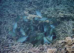 午後もビーチ。もう明日で終わりかあ。カメラを持って入った時、小さいカスミアジのような綺麗なブルーの点点のある魚と黒い魚(名前わからず)が沢山群れて食事をしていた。食べているときは黒っぽいのに、揃って移動するととたんに綺麗なブルーに変わる。とても綺麗で夢中でカメラのシャッターを切ったが、ビデオで無かったのが悔やまれる。でも久しぶりに群れの美しさを堪能した。