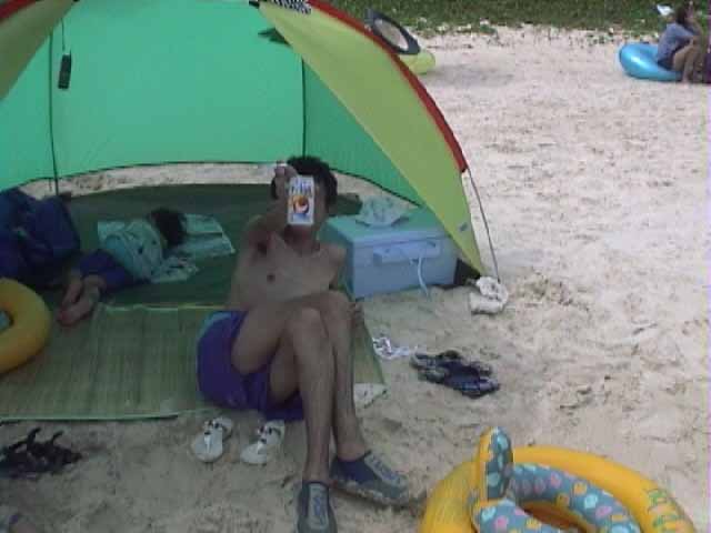 今回は今まで以上に荷物が多い。ビーチテント。巨大ビーチパラソル、これはよくホームセンターなんかで庭に置くような椅子テーブルセットといっしょにおいてあるような、布製のしっかりしたやつ、それも巨大、重いんだ、これが。大人のスノーケリング3点セット、ウエットスーツ。子供のマスクとスノーケル、ゴーグル、ライフジャケット。シャベル。タオル類。洗濯バサミに洗濯ロープ。水中カメラに水中ビデオ。子供のミニバケツ2個。飼育箱。浮き輪2個。宿近くの商店で購入した発砲スチロールのクーラーボックスにロックアイスと飲み物、ビールを入れて。これをえっちらおっちら、徒歩3分くらいの道のりを担いで行くのだ。3分というのは大人の足。子供を追い立て、機嫌取りながらだと、その倍はかかる(-_-;) それでも歩いてくれるようになったものだ。