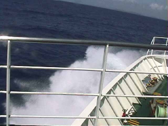 20分ほどで港に到着。急いでチケットを購入してフェリーに乗り込む。高速艇だと35分だがフェリーだと70分かかる。乗り込んだのが遅かったので、じゅうたん敷きのところや客室は空いてないので、デッキ席に座る。風は気持ちがいいが、ちょっと暑いか。高速艇よりは揺れが少ないはずだが、結構揺れるぞ(^^;)前回懲りたので、ちゃんと乗り物酔い用の薬は飲んだけど。どうせなら、と水しぶきを撮影。しばらくすると子供たちは寝てしまった。私もちょっとうとうとして、椅子から何度も滑り落ちそうになった(^^;)