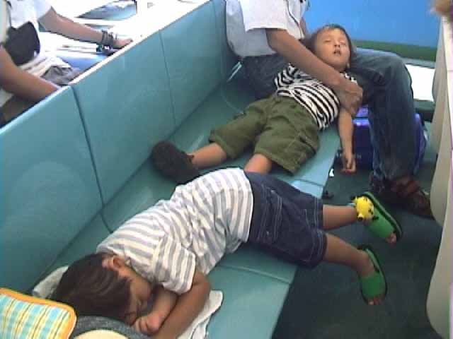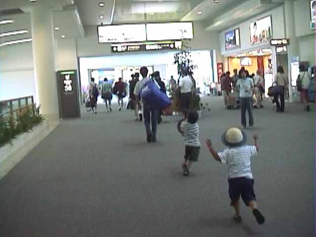 それからチェックインカウンターで荷物を預けるはずが、時間切れで機内持込に。もちろん巨大ビーチパラソルも!大きなスポーツバックとパラソルを肩にかけ、寄り道はするは、気に入らないと座り込んでしまう子供たちをせきたてつつ、搭乗口へ。最後に子供たちをトイレにつれて行き、違う方から出てしまって遠回りしてたらパパに、なにやってんだ!と怒られるし(;_;) 座席に到着したのは出発2分前だった(^^;)
