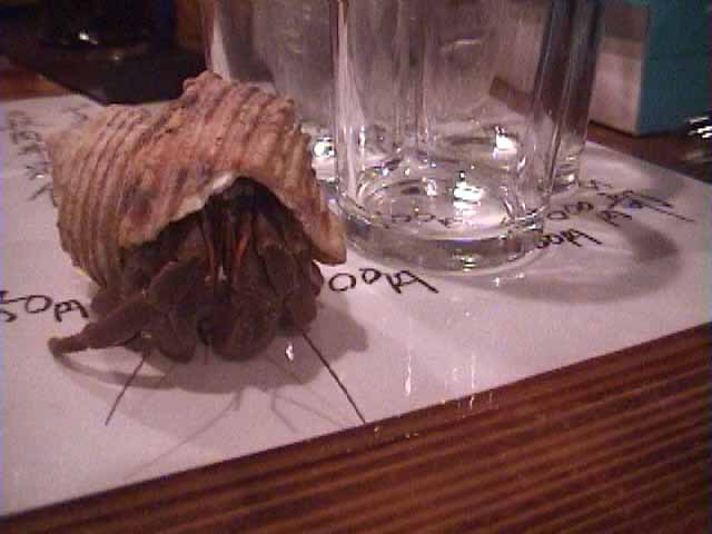 まめやのご主人が巨大ヤドカリを持ってきた。大きいサザエくらいある。なかなか出てこないので、ちょっと先っぽをあぶってみた(^^;)ごめ〜ん、熱かった?おかげで出てきてその雄姿(?)を見ることができた。