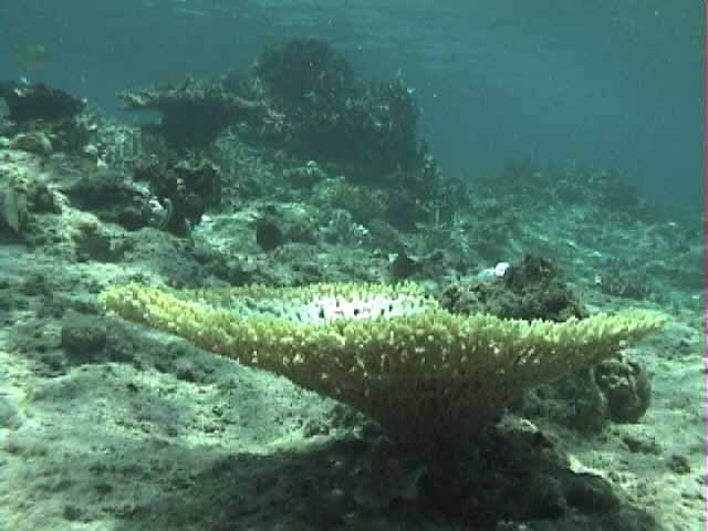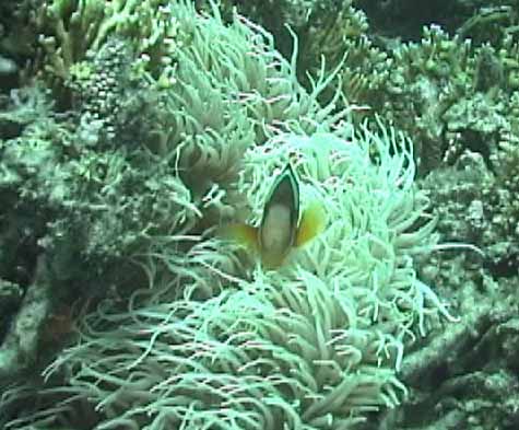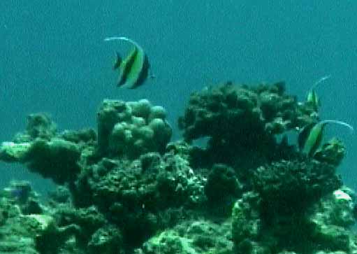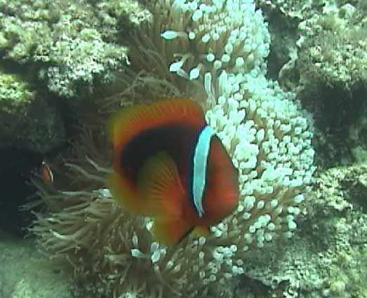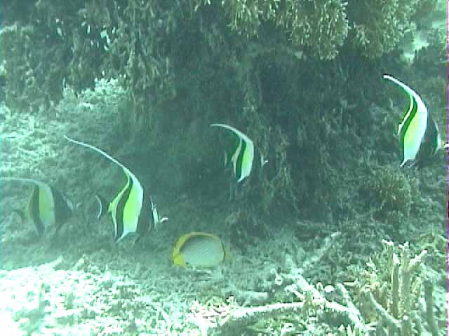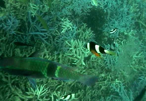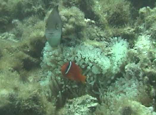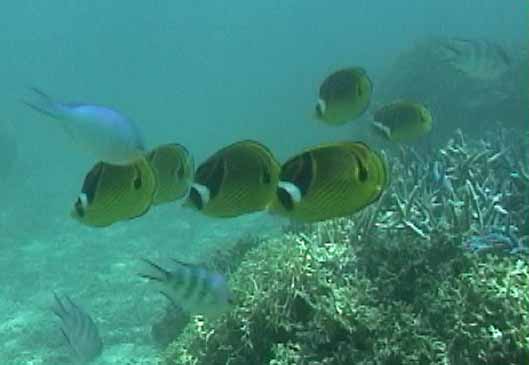 | これも珊瑚の下です。 | チョウチョウウオの集団の一部 | もう1枚ハマクマノミ |