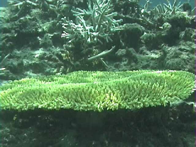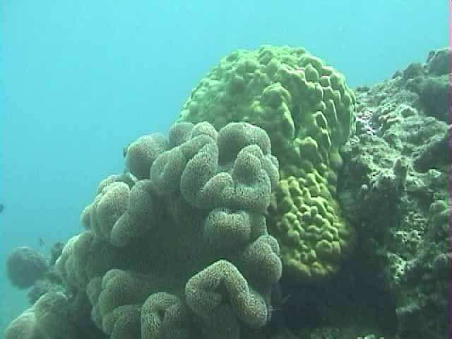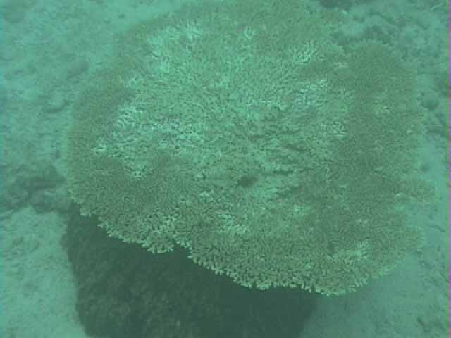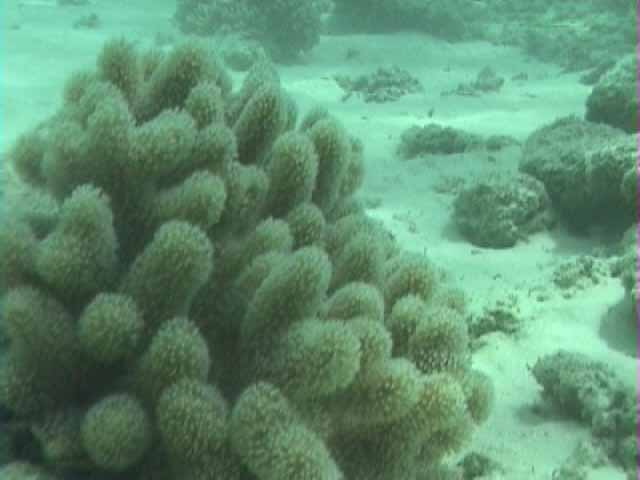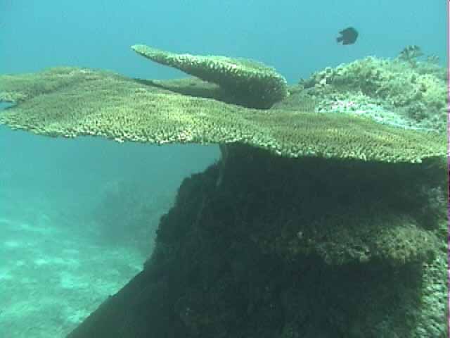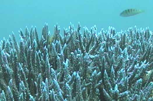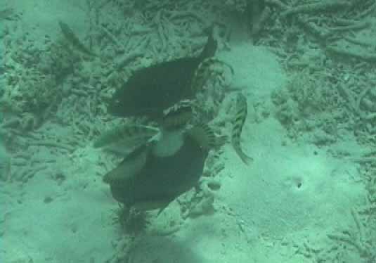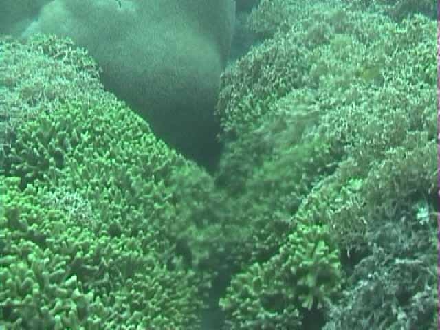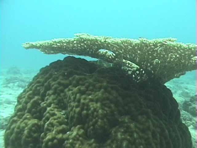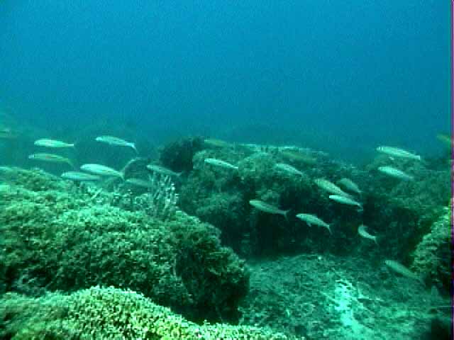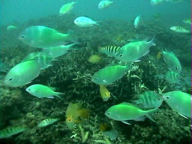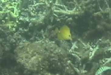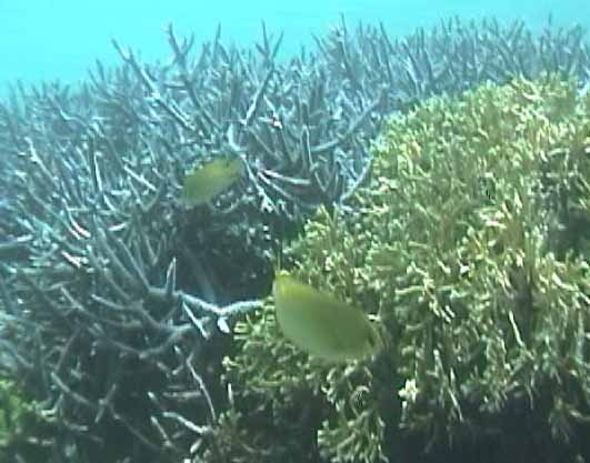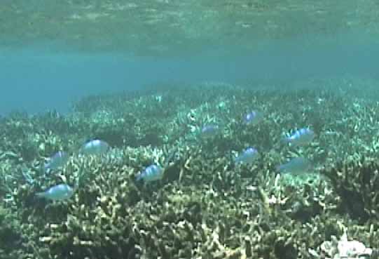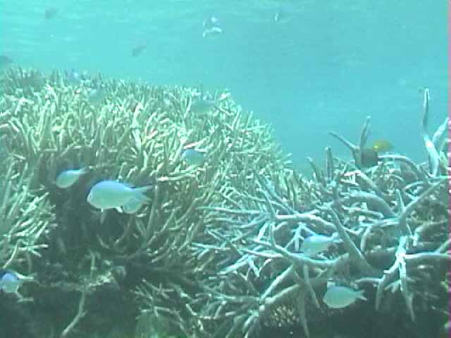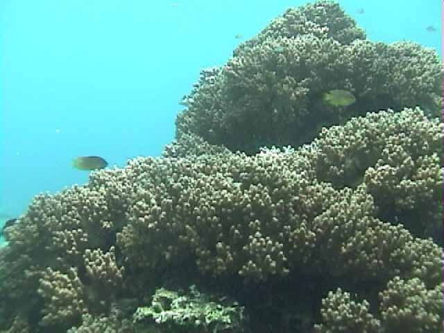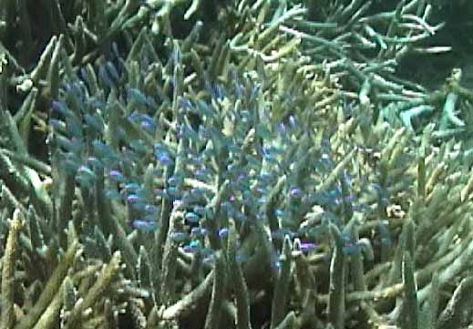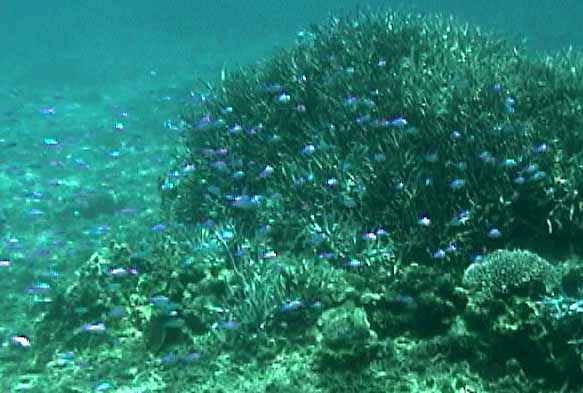 ツノダシが沢山集まってるところがありました。画像では3匹ですが。 | 浅いところの珊瑚に小魚が沢山集まってます。明るいので全体にきらきらしてとてもきれい。 |