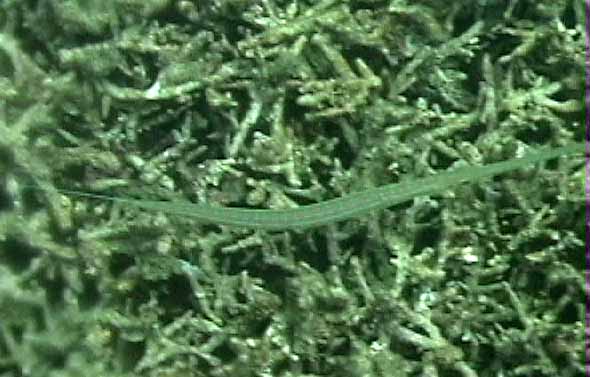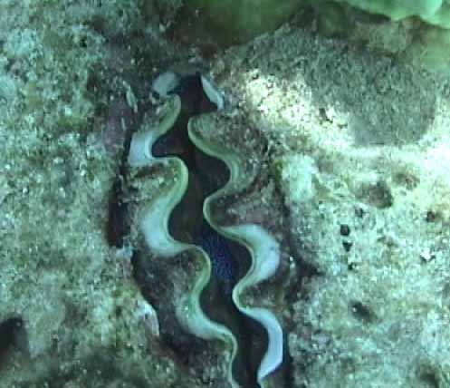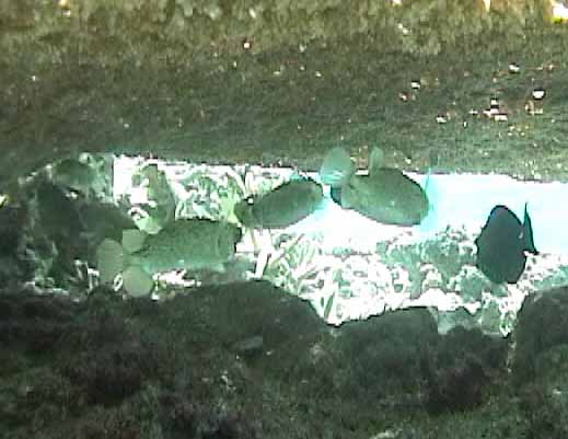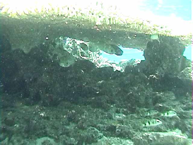 | 見ぃつけた!珊瑚の下に沢山魚が隠れています。 | もうちょっと近づくとこんな感じ。ハリセンボンがいます。 | 岩の間から口をぱくぱく。 |