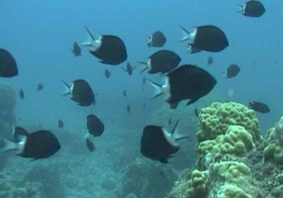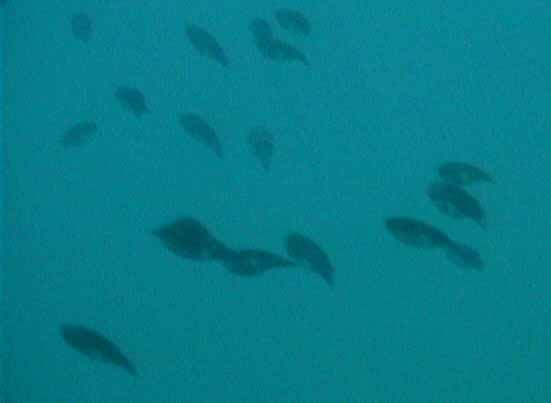 またまたゴマモンガラ。わずかながら、ぎょろっとした白い目がわかるでしょうか。 | イワシのような魚の大群が、渦巻いていました。 |