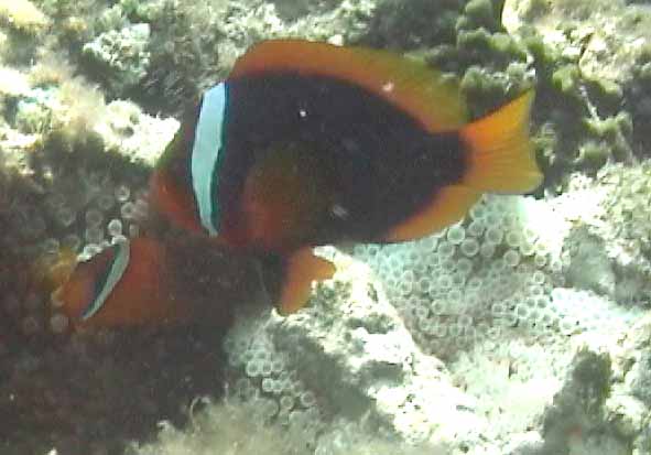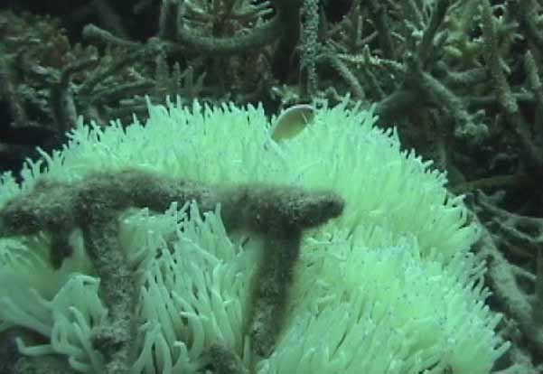 | 黒いスズメダイの一種 | 大好きハマクマノミちゃん。左側には小さい子が顔をのぞかせています。 | 今回はこのクマノミを追いかけていました。白筋が3本。 |