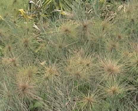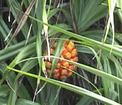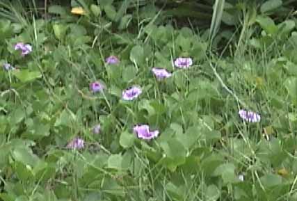 | ビーチの後方の草むらにあったイガ栗みたいな実? | パイナップルみたいなアダンの実。でも食べられないらしい | ビーチ後方に沢山咲いているグンバイヒルガオ |