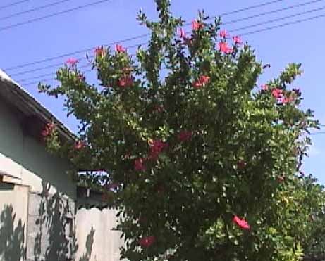 | 民家の高さほどもあるハイビスカスの木。こんなに大きくなるんだ。 |