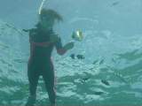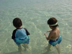 | 四人で沖へ 子供はうきわをロープでつないで 時折餌撒きして魚と戯れ魚を引き連れ 楽しいなあ そのうちに子供が自分で潜れるようになったらもっと楽しいだろうなあ | ![]() |