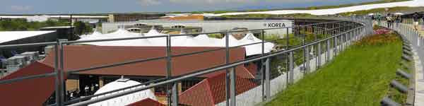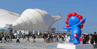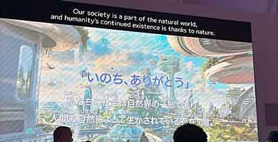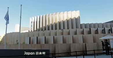 日本館のアテンダントが着用するユニホームは100%リサイクル可能なポリエステル製でボタンやファスナーを使用しない事で分解や分別がしやすく着物のように様々な体形に合うように工夫されているとか?