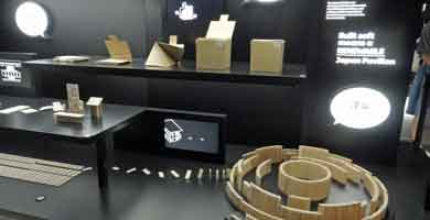 スツール(細かく粉砕して再利用可能な樹脂に藻類を混合した素材)で3Dプリンターで出力し、日本の木造建築の手法を応用して留め具や接着剤を一切使わず組み立てられた物が色々展示されている。