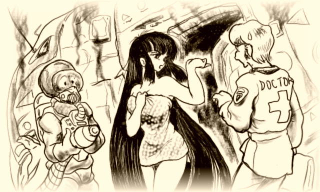 一方、救助隊長は他の隊員達とともに、自分の眼を何度もこすっていた。が、それは消えることなく目の前にいた。バスタオル一枚をまとっただけの長身の美女。くるぶしまである漆黒の髪はいましがたシャワーをあびたばかりのように濡れている。唾を飲み込む音があちこちから聞こえる。なにしろ彼女の唯一の着衣であるバスタオルは、豊かに盛り上がったバストから一度充分にくびれて再びバストと同サイズぐらいになるという体の線を、かろうじて覆っているだけなのだから。その辺のモデル顔負けのプロポーションだ。しかしそんな男達の視線をまったく気にする様子もなく、彼女は自分の体をひととおり点検し終え言った。