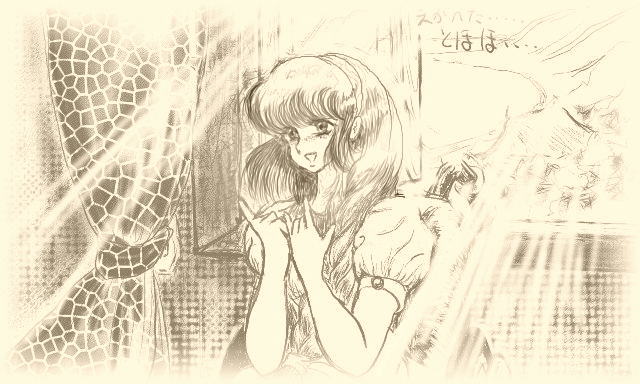 (すいませんちょっとイメージがちがうような。とほほ・・・。これも現在の画力のなさが原因です。でもタブレットだけで書くのはむずかしいよー。ワコム アートパッドとウルトラキッド使用。20年のギャップは思った以上にでかい・・・・。)