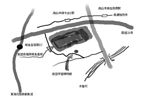 各務原航空自衛隊岐阜基地 各務原航空宇宙博物館 41号線美濃加茂市で左折し、国道21号線を西進。木曽川沿いにずっといくと道路端にある。入り口は岐阜基地を左に見て向こう側、はじっこの信号を左折。しばらく行って左側。 航空宇宙博物館はそのまま直進したところにある。入場料1000円。ただし、外部展示は無料で見ることができる。 YS11、新明和対潜哨戒機等がある。